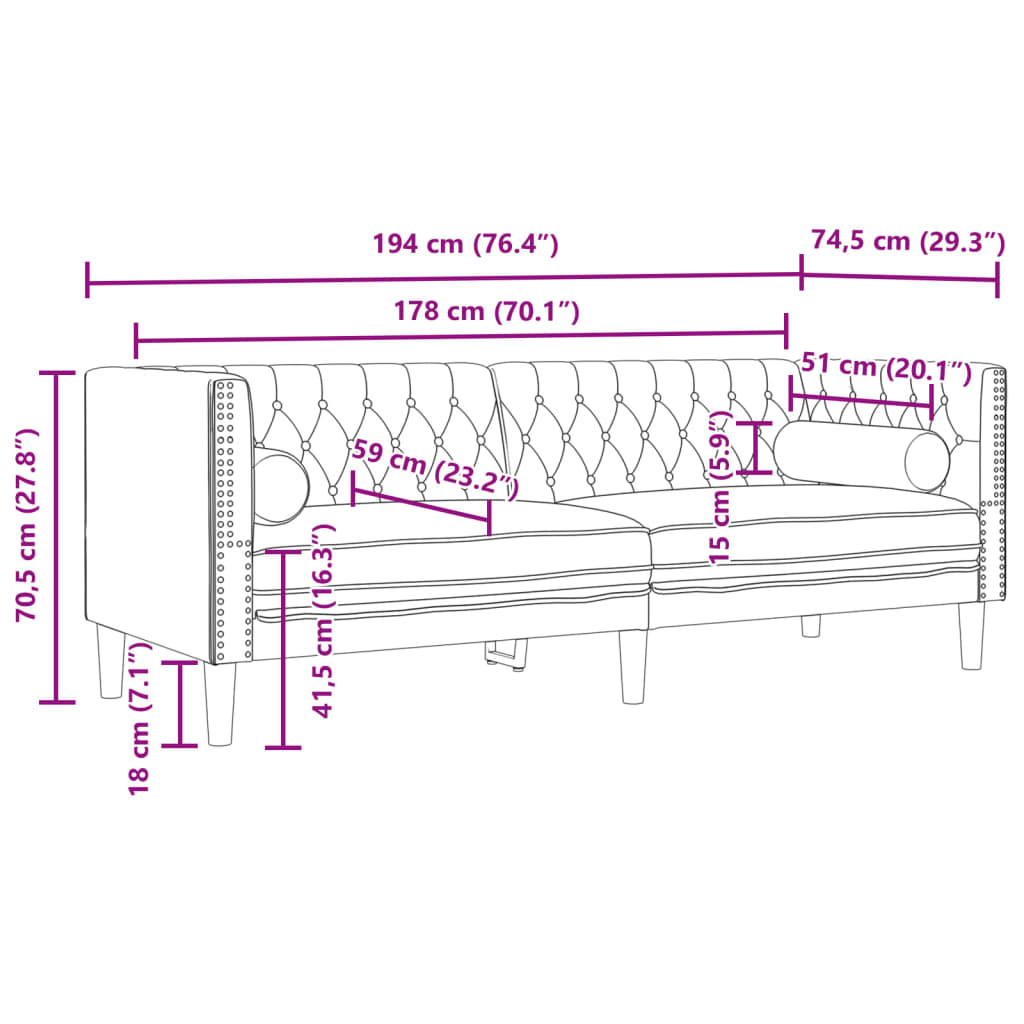 Diese Chesterfield-Sofas bietet den idealen Platz zum Plaudern, Lesen, Fernsehen oder einfach nur zum Entspannen. Die Sofagarnitur wird ein echter Blickfang in deinem Zuhause sein. Weiches und komfortables Material: Der Samtstoff hat eine weiche und sanfte Oberfläche, die sich angenehm auf der Haut anfühlt und höchsten Komfort bietet.Bequemes Sitzerlebnis: Dank der dick gepolsterten Sitzflächen, Armlehnen und Rückenkissen ist das Sofa sehr bequem. Die im Lieferumfang enthaltenen Nackenrollen verschönern nicht nur deine Einrichtung, sondern werden auch zusätzlichen Sitz- und Liegekomfort bieten.Chesterfield-Stil: Mit dem klassischen Rückenlehne und den Armlehnen mit Knopftuft und einer einheitlichen Rücken- und Armhöhe wertet das Sofa jeden Wohnraum auf und bietet sowohl Stil als auch Komfort.Stützbeine: Der Polstersessel wird von stabilen Beinen getragen, die seine Stabilität und Standfestigkeit gewährleisten.