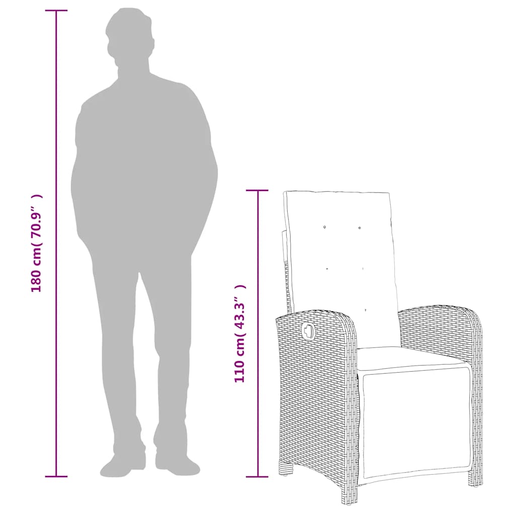 Genieße eine Tasse Kaffee oder unterhalte dich mit deiner Familie und deinen Freunden im Garten, Hinterhof oder auf dem Balkon an dieser bequemen Garten-Essgruppe! Langlebiges Material: PE-Rattan, auch als Poly Rattan bekannt, ist ein robustes, pflegeleichtes synthetisches Material, das die Optik von natürlichem Rattan aufweist. Es kennzeichnet sich durch ein geringes Eigengewicht und lässt sich einfach reinigen. Aufgrund seiner Haltbarkeit und Witterungsbeständigkeit wird es häufig bei der Herstellung von Gartenmöbeln verwendet.Verstellbare Rückenlehne und Fußstütze: Der Gartensessel ist mit einem Griff versehen. So kannst du die Rückenlehne und den Fußteil durch Ziehen des Griffs verstellen und sie danach schnell wieder in ihre ursprüngliche Position bringen.Bequemes Sitzerlebnis: Dieser Gartensessel mit dick gepolsterten Kissen bietet ein angenehmes Sitzgefühl.Abnehmbarer und waschbarer Bezug: Die Sitzkissen verfügen über abnehmbare Bezüge, die sich ganz einfach waschen und reinigen lassen. Dank der Klappen an der Rückseite können die Rückenkissen ganz einfach an den Rückenlehnen befestigt werden.Tischplatte aus Glas: Die Tischplatte des Gartentisches besteht aus starkem und langlebigem Hartglas, sodass sie leicht mit einem feuchten Tuch gereinigt werden kann und deinem Außenbereich einen Hauch von Eleganz verleiht. Gut zu wissen:Wir empfehlen dir, deine Gartenmöbel mit einer wasserdichten Hülle zu schützen, um lange Zeit eine ansprechende Optik aufzuweisen.