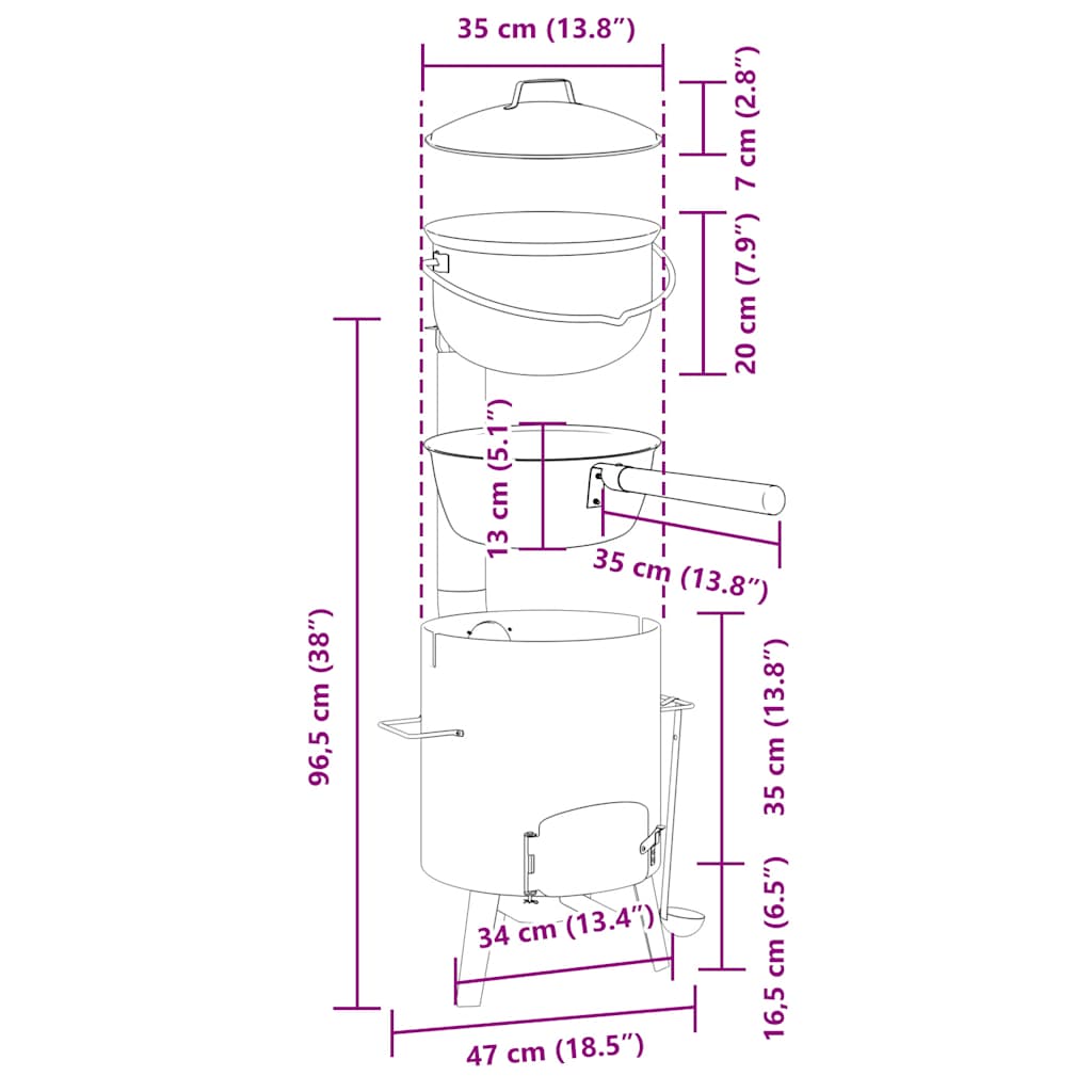 Diese Gulaschkanone wird samt dem nötigen Zubehör geliefert und ist eine perfekte Wahl für Gartenpartys, Outdoor-Küchen, Festivals, Camping und mehr! Mit diesem praktischen Gulasch-Set wertest du dein Kocherlebnis im Freien sofort auf! Allrounder für die Outdoor-Küche: Egal, ob du eine herzhafte Erbsensuppe, würziges Chili con Carne, traditionelles ungarisches Gulasch oder warmen Punsch oder Glühwein zubereiten möchtest, diese Gulaschkanone ist genau das Richtige für dich. Der mitgelieferte Rost macht auch das Grillen von Steaks oder knusprigen Hähnchen zum Kinderspiel.Praktische Bedienung: Fülle einfach die große Brennkammer mit Holz, Holzkohle oder Kohle, um loszulegen! Die integrierte Feuerklappe ermöglicht die Regelung der Luftzufuhr und erleichtert das Nachfüllen.Einfache Reinigung: Dieser Gartenofen verfügt über einen praktischen Aschenbehälter und lässt sich daher sauber bedienen. Die verbrannte Asche fällt durch mehrere Löcher am Boden in den Behälter, wodurch die Verstopfung der Brennkammer verhindert wird.Rauchfrei: Der extralange Rauchabzug mit Regenhaube leitet Rauch und Dämpfe effektiv und sicher vom Ofen ab.Geringes Eigengewicht und einfacher Transport: Dank der Leichtbauweise und der zwei Seitengriffe lässt sich der Outdoor-Ofen mühelos überallhin transportieren.