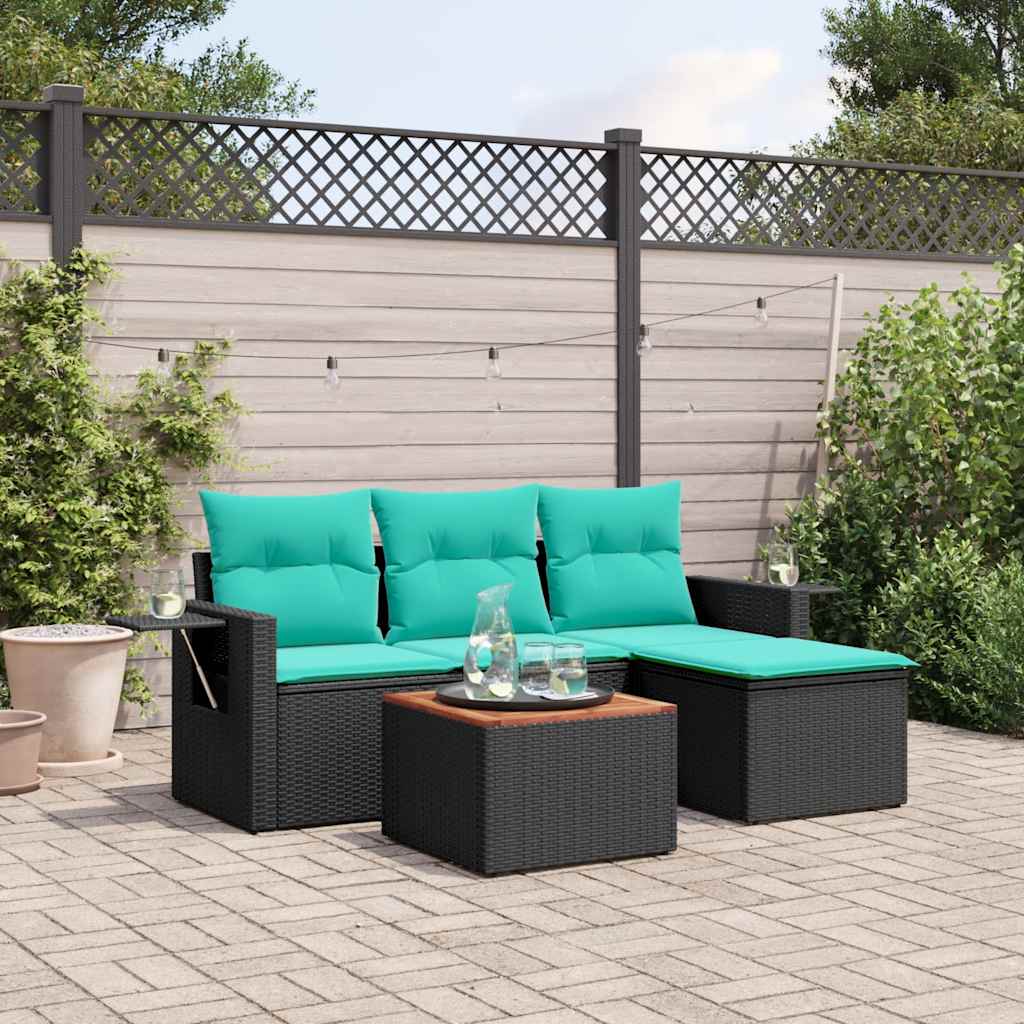 5-teiliges Gartensofa-Set mit Kissen, schwarzes Polyrattan