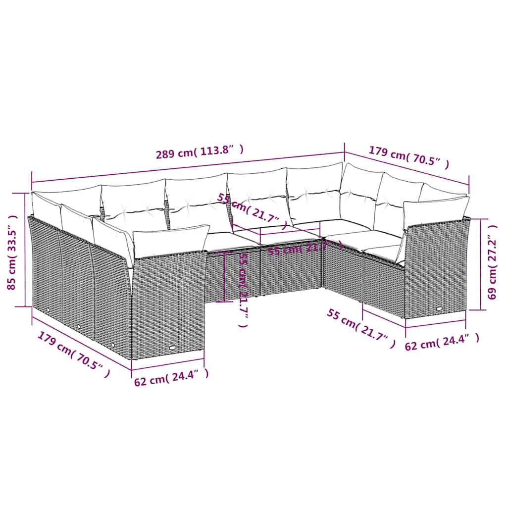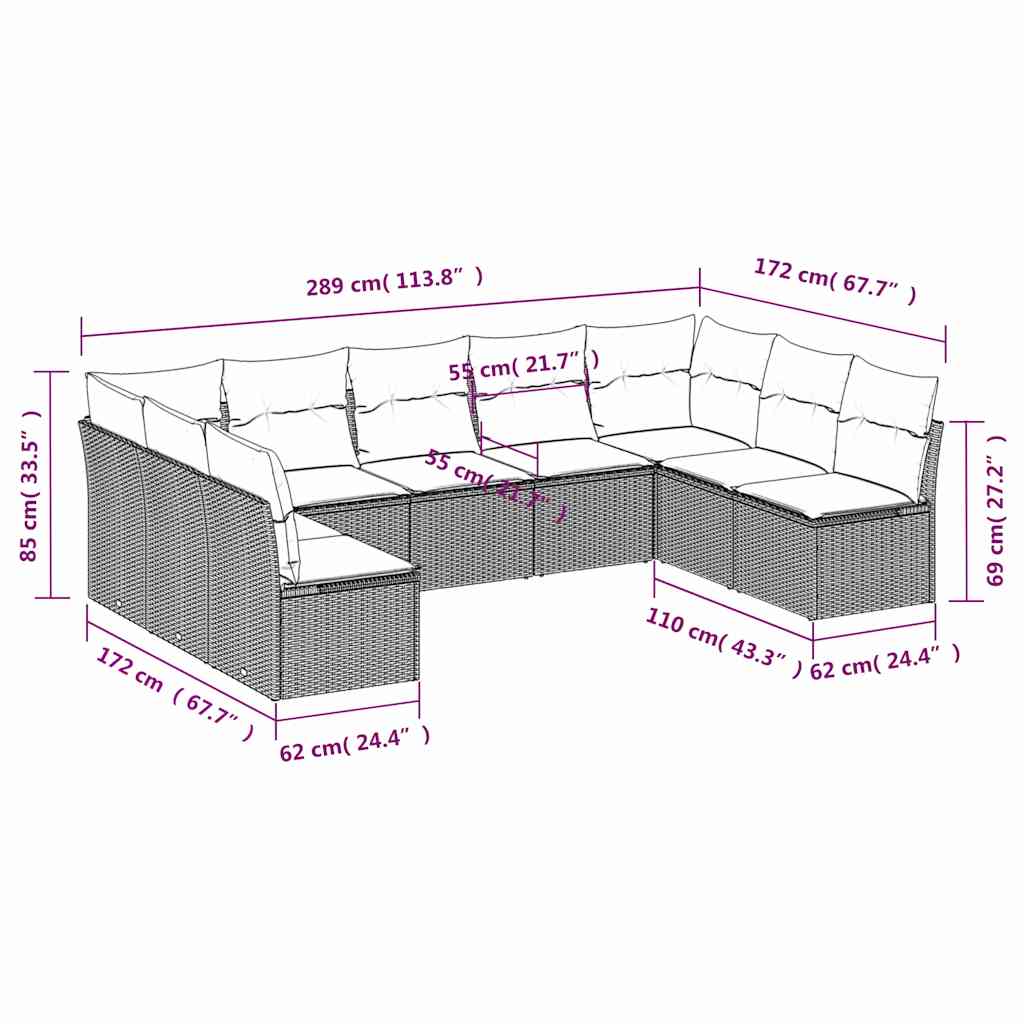 10-teiliges Gartensofa-Set mit Kissen, schwarzes Polyrattan