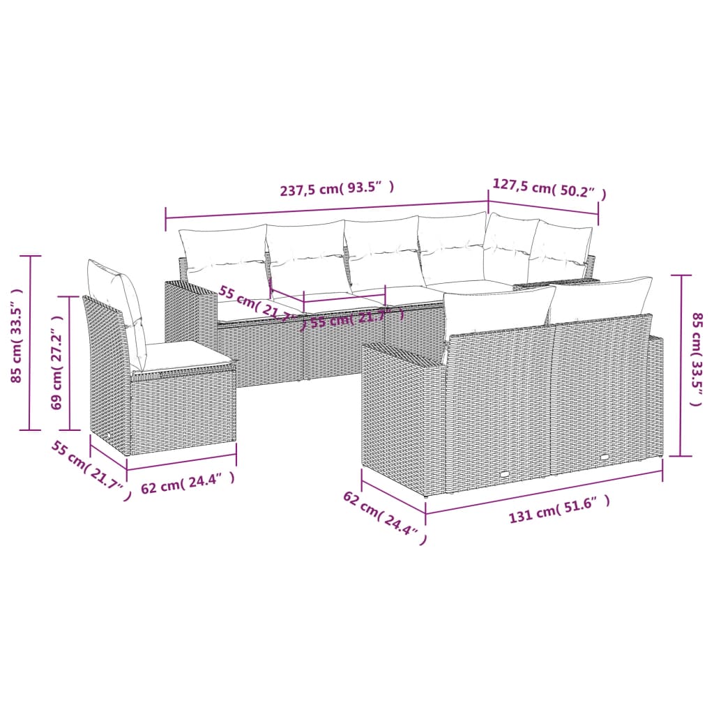 9-tlg. Garten-Sofagarnitur mit Kissen Braun Poly Rattan
