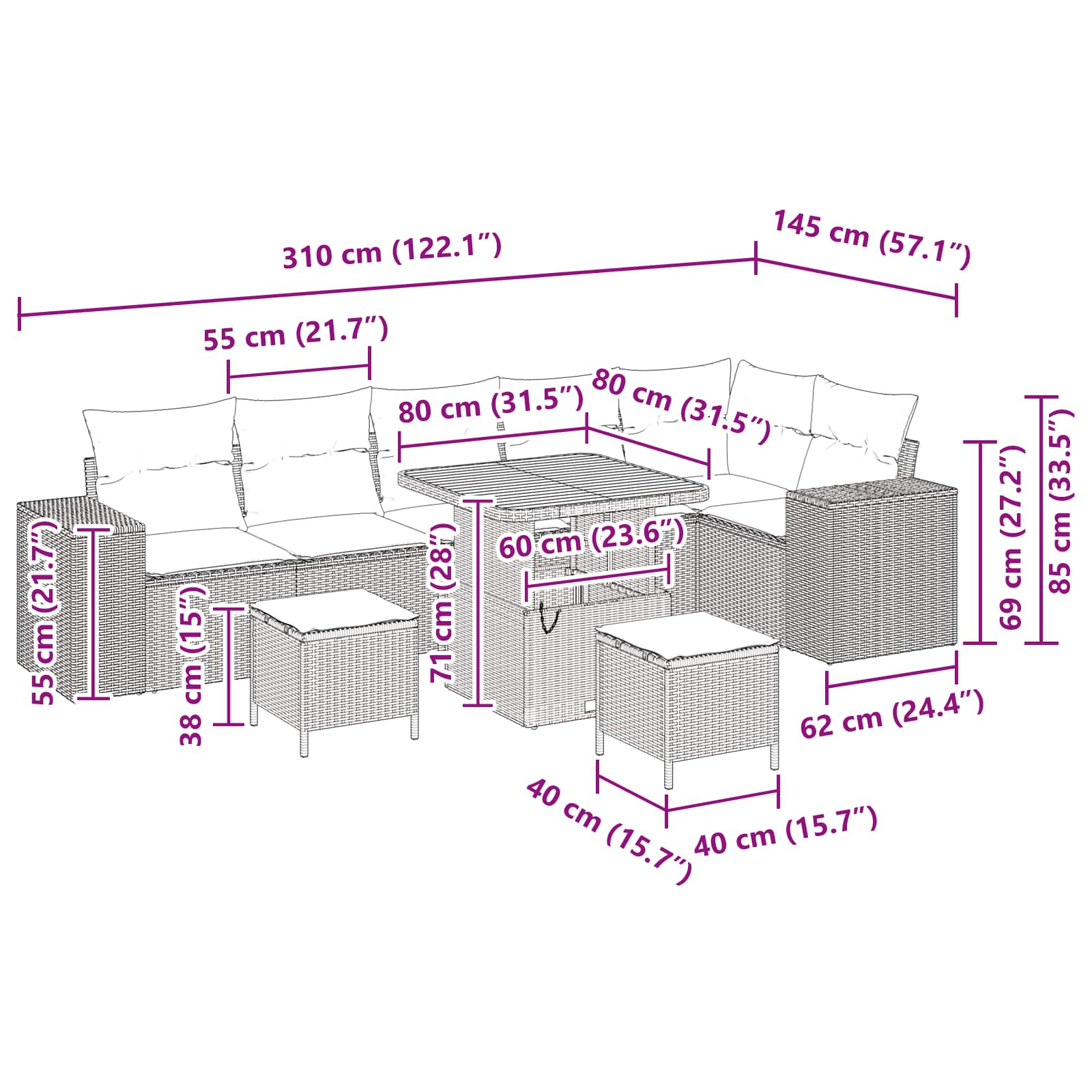 Dieses modulare Garten-Sofa-Set passt sich super an jeden Außenbereich an und verbindet Stil mit Funktionalität. Die schlichte Eleganz macht es ideal für Balkone, Terrassen oder Gärten. Es lässt sich flexibel einsetzen, ob für gesellige Treffen oder entspannte Stunden. Materialien: Das Sofa-Set besteht aus hochwertigem Poly-Rattan, das für seine Langlebigkeit bekannt ist. Es sieht auch nach längerer Sonneneinstrahlung und Nässe klasse aus. Das Material macht das Set ideal für den Außenbereich. Inklusive Komponenten: Im Set findest du eine breite Poly-Rattan-Armlehne, eine fertig gestaltete Rückseite und eine massive Akazienholzplatte, die dein Außendekor perfekt ergänzt. Stabilität bringt dir die robuste Beinstruktur. Eigenschaften / Funktion / Design: Mit dem höhenverstellbaren Tisch bist du super flexibel und kannst vom Kaffeetisch gleich zum Esstisch wechseln. Das leichte modulare Set erlaubt es dir, die Möbel ganz einfach neu anzuordnen. Empfohlene Verwendung: Perfekt für den Frühling und Sommer, das Sofa-Set macht draußen richtig Laune, egal ob in Gärten oder auf Terrassen. Es passt sich locker verschiedenen Deko-Stilen an. Pflege & Wartung: Um die Gartenmöbel lange schön zu halten, ist es ratsam, eine Schutzhülle zu nutzen, wenn sie nicht gebraucht werden. So bleibt der Zustand bei wechselhaftem Wetter garantiert gut.