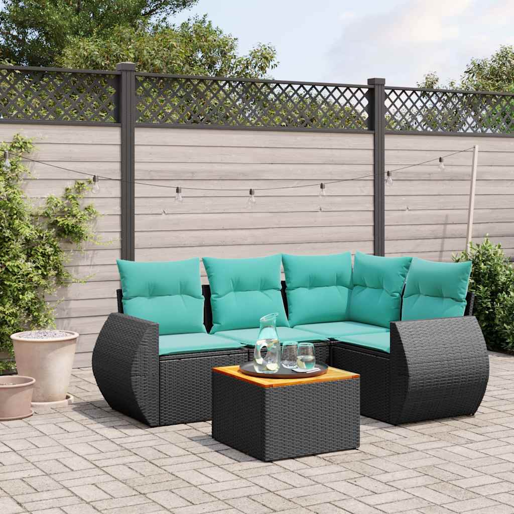 5-teiliges Gartensofa-Set mit Kissen, schwarzes Polyrattan