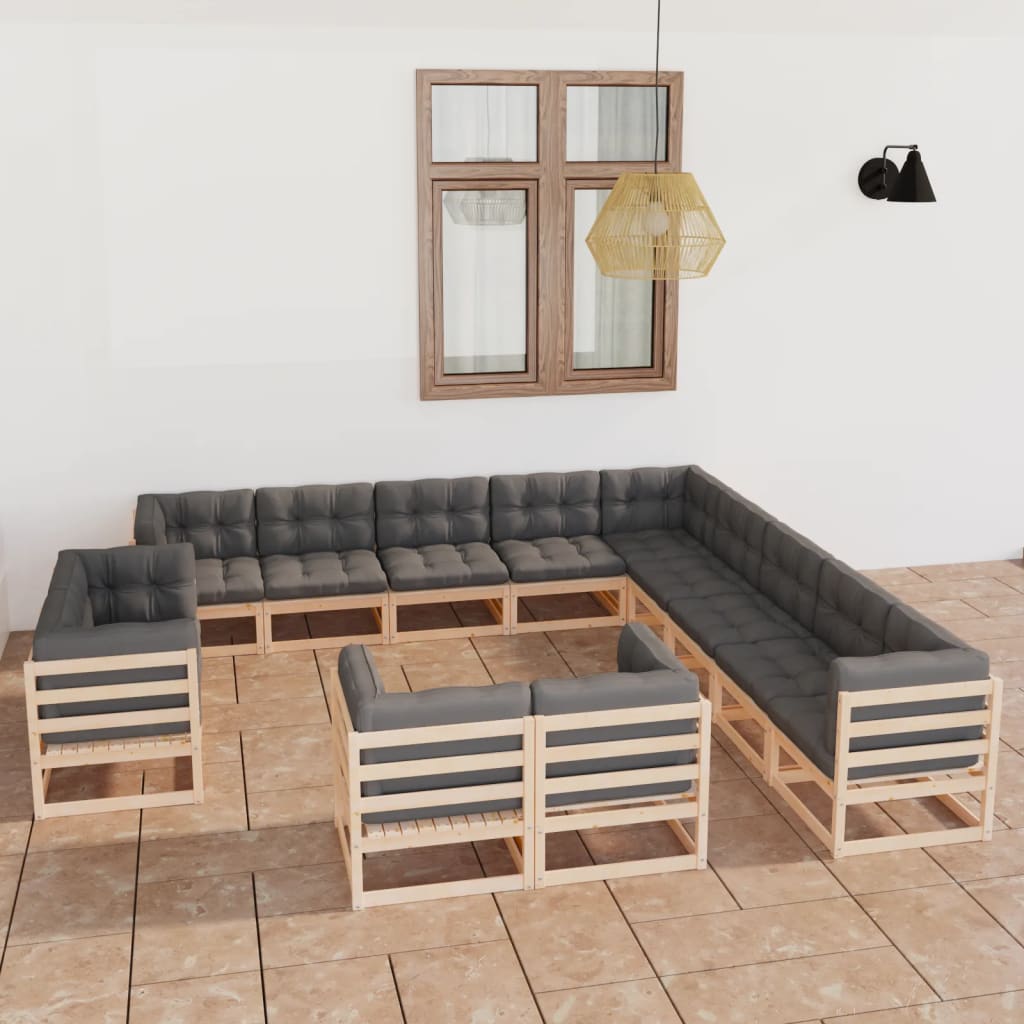 14-tlg. Garten-Lounge-Set mit Kissen Grau Kiefer Massivholz