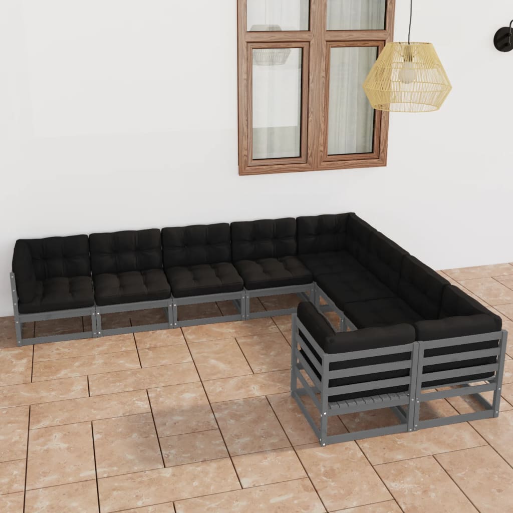 10-tlg. Garten-Lounge-Set mit Kissen Grau Kiefer Massivholz