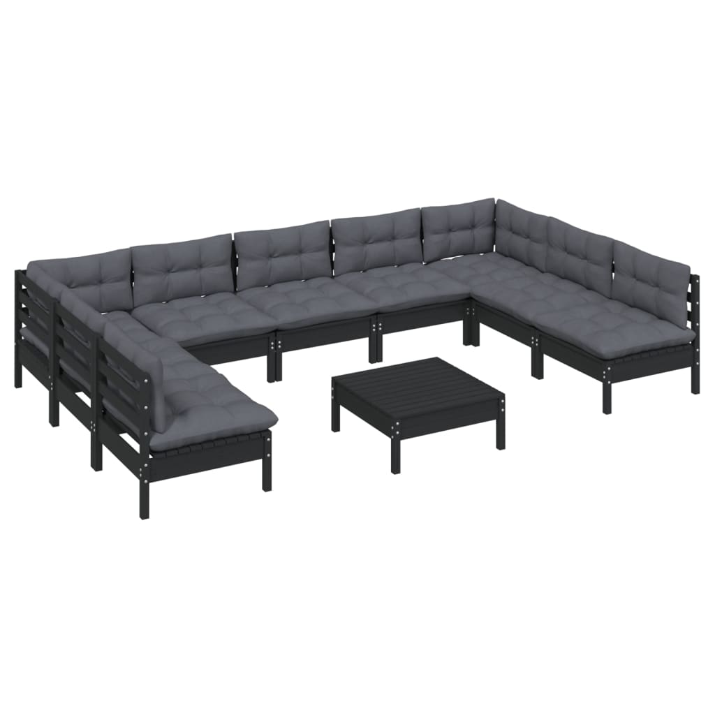 11-tlg. Garten-Lounge-Set mit Kissen Schwarz Kiefer Massivholz