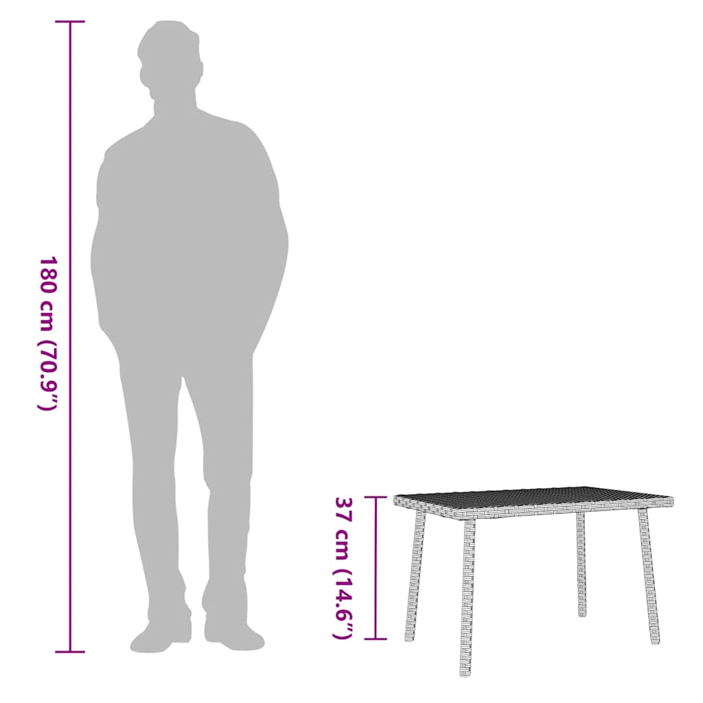 An diesem Garten-Couchtisch kannst du eine Tasse Kaffee genießen oder mit Familie oder Freunden im Wohnbereich plaudern! Langlebiges Material: PE-Rattan, auch als Poly Rattan bekannt, ist ein robustes, pflegeleichtes synthetisches Material, das die Optik von natürlichem Rattan aufweist. Es kennzeichnet sich durch ein geringes Eigengewicht und lässt sich einfach reinigen. Aufgrund seiner Haltbarkeit und Witterungsbeständigkeit wird es häufig bei der Herstellung von Gartenmöbeln verwendet.Stabile und robuste Tischplatte: Die stabile Tischplatte bieten den idealen Platz für Getränke oder andere Sachen, die du griffbereit haben möchtest.Robuster und stabiler Rahmen: Dank des pulverbeschichteten Stahlrahmens ist das Möbelstück robust, stabil und für den täglichen Einsatz im Außenbereich geeignet. Gut zu wissen:Wir empfehlen dir, deine Gartenmöbel mit einer wasserdichten Hülle zu schützen, um lange Zeit eine ansprechende Optik aufzuweisen.